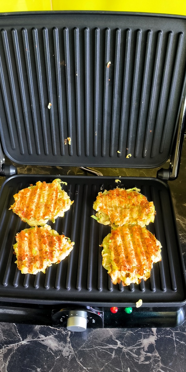 Ингредиенты: - Кабачок — 1 шт. - Яйцо — 1 шт. - Мука — 6 ст. ложки - Соль — по вкусу - Специи (черный перец, паприка, укроп или ваши любимые) — по вкусу Приготовление: 1. Подготовка кабачка: - Вымойте кабачки и натрите их на крупной терке. - Поместите натертый кабачок в дуршлаг или марлю, слегка отожмите, чтобы избавиться от лишней влаги. Чем суше кабачок, тем лучше! Оладьи не будут разваливаться. 2. Приготовление теста: - В глубокой миске соедините натертый кабачок, яйцо и соль. Хорошо перемешайте. - Постепенно добавьте муку, тщательно перемешивая, чтобы масса стала немного густой и держалась вместе. - Добавьте специи по вкусу и перемешайте еще раз. 3. Подготовка к жарке: - Разогрейте электрогриль до средней температуры. 4. Формирование оладий: - Ложкой выкладывайте порции теста на решетку, немного прижимая для получения аккуратных оладий. 5. Жарка: - Готовьте оладьи на электрогриле до золотистой корочки. 6. Подача: - Выложите готовые кабачковые оладьи на