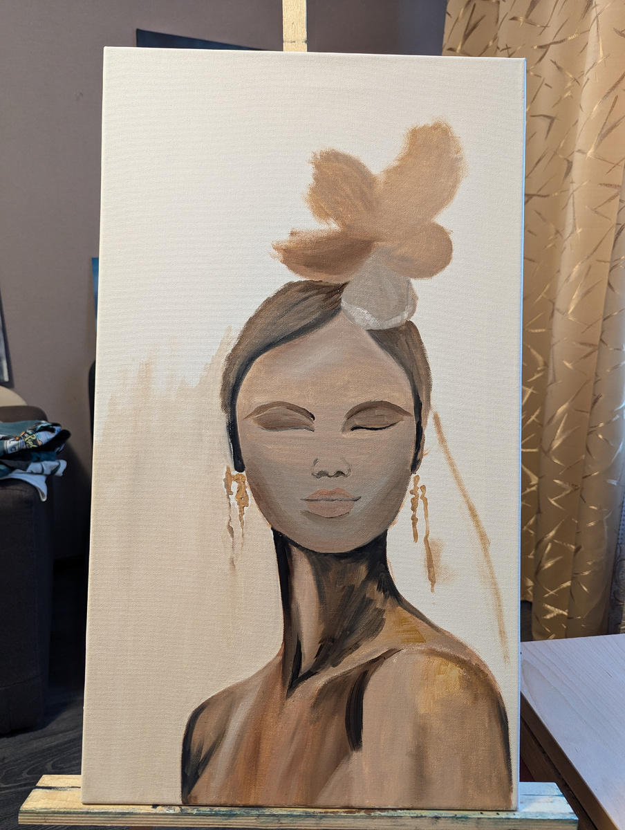 Всех приветствую! Хочется с вами поделиться процессом написания авторской картины маслом. С чего я начала...Взяла холст, масло, кисти и понеслось...Меня настолько захватил этот процесс, что я уже не могла остановиться... Наметила черты лица, которые близки по духу, вообще, все делала исходя из образов и фантазии в моей голове. Представляла, кто эта кроткая девушка, где она живёт, какая у нее судьба и о чем она думает... Наверное, писала картину, исходя из своего опыта, из того, кто я сама, о своих мечтах, стремлениях и потихоньку стал вырисовываться идеальный (для меня) образ благородной, ранимой, но все таки сильной девушки. И вот к какому образу в итоге я пришла. В данном образе важны аксессуары, такие как серьги. Для меня это часть жизни и я очень часто меняю сережки. Хотела придать девушки лёгкость с помощью вот такой вот милой бабочки, а далее приступила к другой серьге. Для меня птичка-символ счастья, свободы и трогательности. Именно такими я вижу идеальных спутников жизни деву