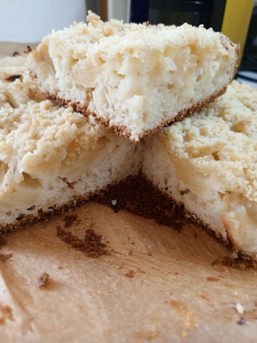 Пирог с яблоками. Кексовое тесто и штрейзельная посыпка. Основа одна, меняем фрукты-ягоды и каждый день новый вкус! Кондитерские отдыхают! 2 яйца и 150 г сахара слегка взбить. 80 мл молока, 80 мл масла (растительное, или кокосовое, или оливковое), , 10 г разрыхлителя, 250 г муки. Хорошо перемешать. Форма 32х22. На тесто выложить яблоки. Посыпка: 1 ст.ложка сливочного масла, 1 ст.ложка муки, можно добавить щепотку сахара. Растереть всё в крошку, высыпать сверху. Готовьте с удовольствием! #готовимдомавкусно#пироги#фруктовыйпирог#яблочныйпирог#выпечка#десерт#яблоки