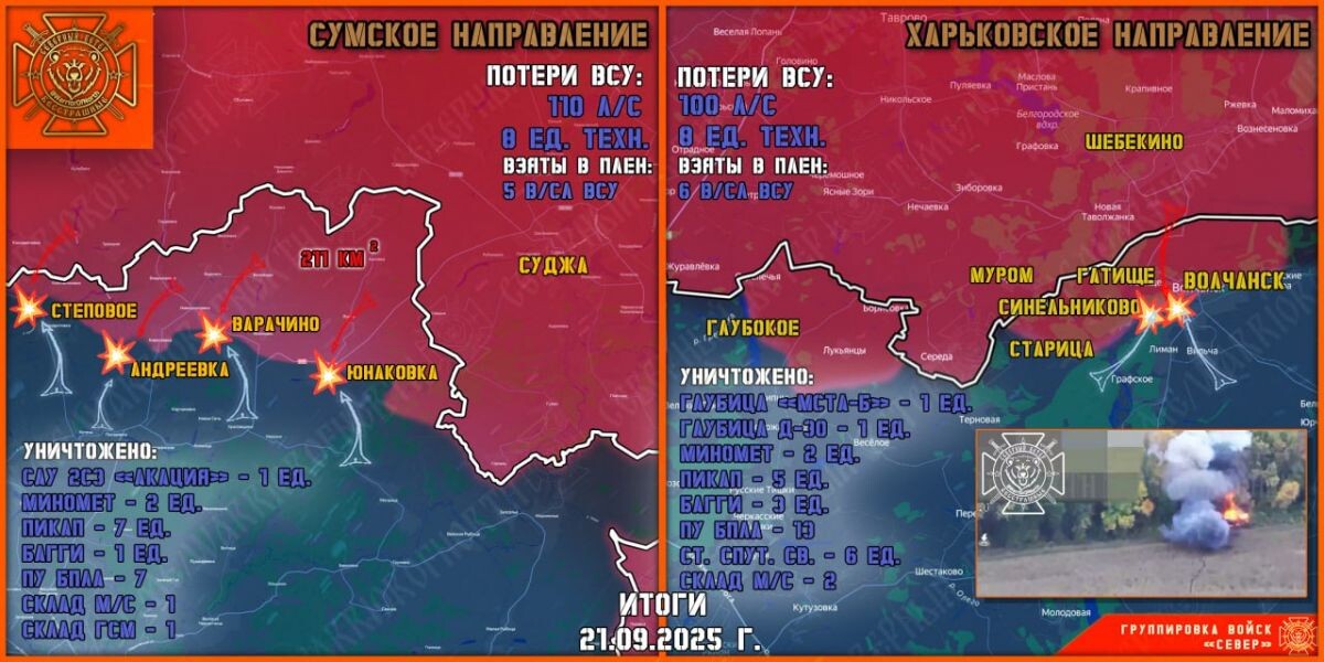 К утру 22 сентября группировка войск «Север» рассказала о формировании полосы безопасности в Харьковской и Сумской областях, в том числе у границы с Курской областью. ВСУ возобновили контратаки на фланги наступающей армии России. В лесных массивах возле Варачино морпехи продвинулись на 200 метров и закрепились. В результате боев в Сумской области 80 одшбр ВСУ потеряла больше половины личного состава. В некоторых ротах один командир взвода руководит сразу несколькими подразделениями. «На Теткинском и Глушковском участках фронта без существенных изменений. Противник активных действий не предпринимал», рассказали в тг-канале «Северный ветер».