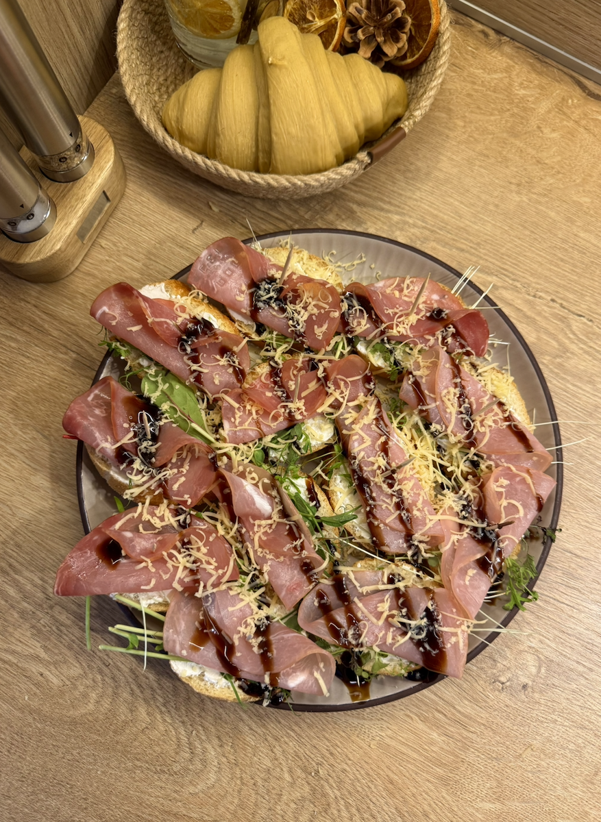 🧀 Тёртый сыр Рецепт: 1. Нарежь багет и подсуши в духовке 2 минуты при 180°C. 2. Смажь творожным сыром и добавь свежую микрозелень. 3. Сверни ломтик балыка, закрепи зубочисткой, чтобы мясо не разворачивалось. 4. Полей ароматным бальзамическим соусом, присыпь сыром. Идеально к вину🍷 #рек #рекомендации #фудблог #закуска #брускетта #итальянскаякухня #завтрак #еда #рецепт