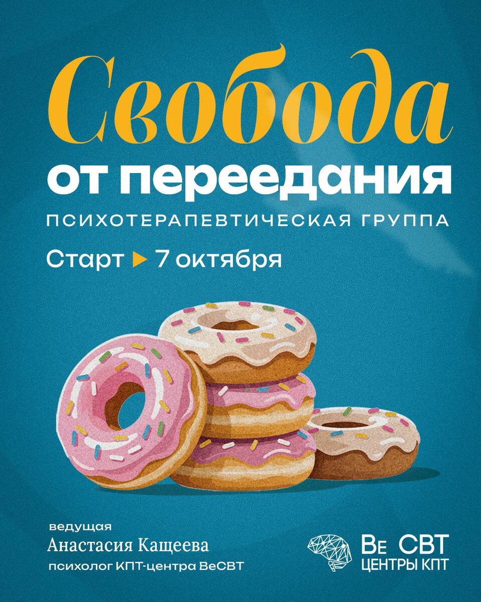 🔸 Проблема расстройств пищевого поведения (РПП) в последние десятилетия приобретает характер эпидемии, а возраст начала заболевания диагностируется уже у детей шести-восьми лет. Строгие диеты, бесконечные ночные походы к холодильнику, переедание при стрессовых ситуациях — все это может являться симптомами расстройств пищевого поведения (РПП), которые снижают качество жизни и приводят к проблемам со здоровьем. Международные руководства по лечению РПП рекомендуют когнитивно-поведенческую психотерапию как психотерапию первого выбора, с доказанной эффективностью, которая направлена на изменение дисфункциональных мыслей, убеждений и болезненного поведения, влияющих на появление и поддержание симптомов. 📌 7 октября начнутся занятия в группе «Свобода от переедания». В результате занятий вы: 💚Обретете контроль над питанием и весом; 💚Почувствуете себя спокойнее и увереннее; 💚Снизите тревогу по поводу своего веса и фигуры; 💚Перестанете “заедать” негативные эмоции; 💚Начнете питаться б