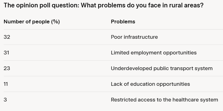 Imagine that you are doing a project on what problems people have in rural areas in Zetland. You have found some data on the subject – the results of the opinion polls (see the table below). Comment on the data in the table and give your opinion on the subject of the project. Write 200–250 words. Use the following plan: - make an opening statement on the subject of the project; - select and report 2–3 facts; - make 1–2 comparisons where relevant and give your comments; - outline a problem that can arise with moving from rural areas and suggest a way of solving it; - conclude by giving and explaining your opinion on the importance of rural development. I am doing a project on what problems people face in rural areas in Zetland. I have found some data from an opinion poll on this subject. In this essay, I will analyze the results and express my opinion on the importance of addressing these issues. According to the poll, which asked "What problems do you face in rural areas?", the most c