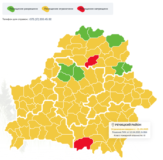 С 21 сентября в Речицком районе введено ограничение на посещение лесов. В связи с угрозой возникновения лесных пожаров вследствие неблагоприятных погодных условий и установившимся III классом пожарной опасности по условиям погоды с целью выявления и пресечения фактов нарушения ограничения посещения лесов гражданами, государственная лесная охрана переходит на усиленное патрулирование территории лесного фонда. “Рейдовые мероприятия будут осуществляться по всей территории Речицкого опытного лесхоза”, – заявили в ведомстве. В период ограничений запрещено разжигать костры в лесах, проводить турслеты, школьные экскурсии и другие массовые мероприятия, заезжать на машинах. Нарушителям запретов грозит штраф – до 12 базовых величин. Если нарушение стало причиной серьезного пожара (была уничтожена или повреждена часть леса), штраф может доходить до 30 базовых.