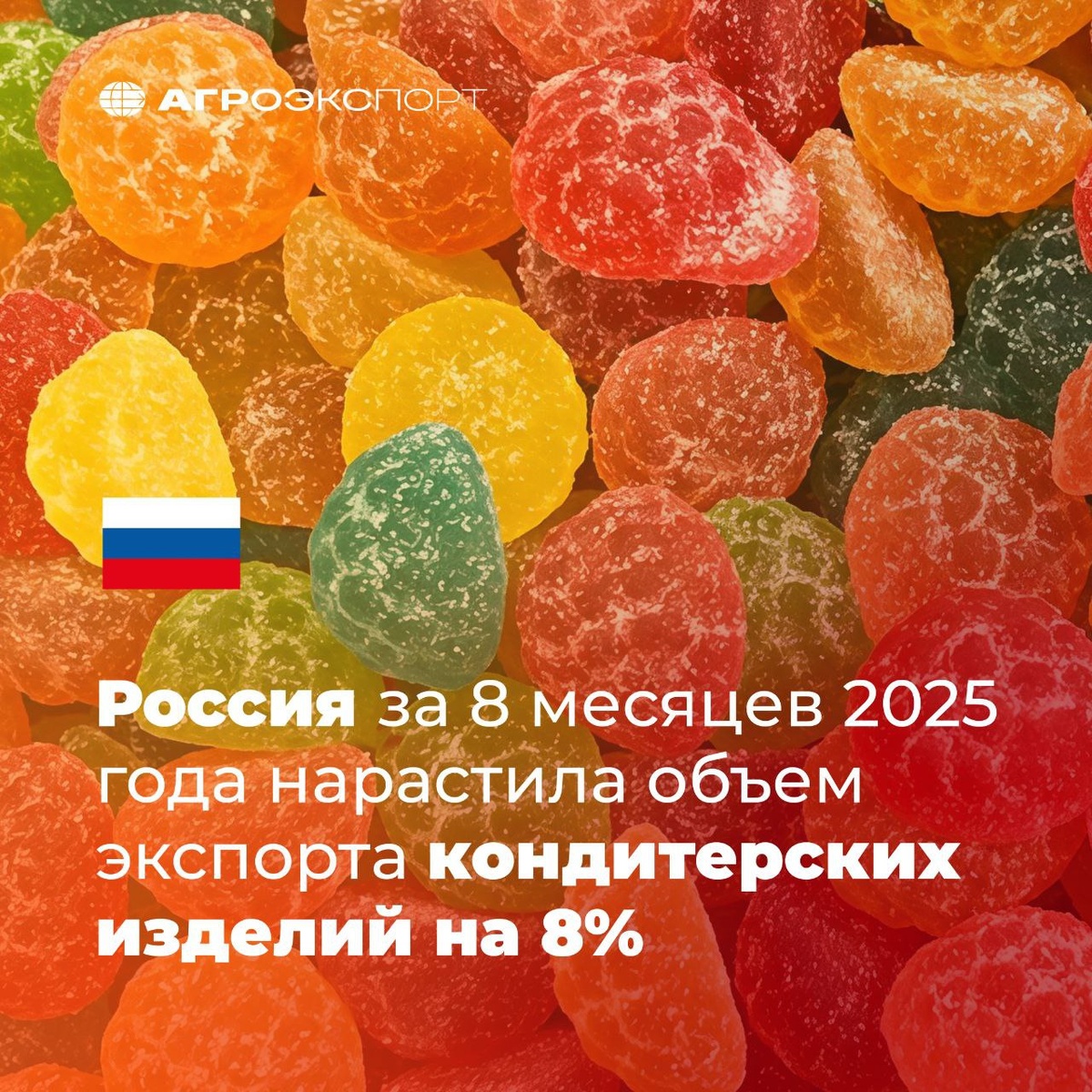 Россия за 8 месяцев 2025 года нарастила объем экспорта кондитерских изделий на 8%