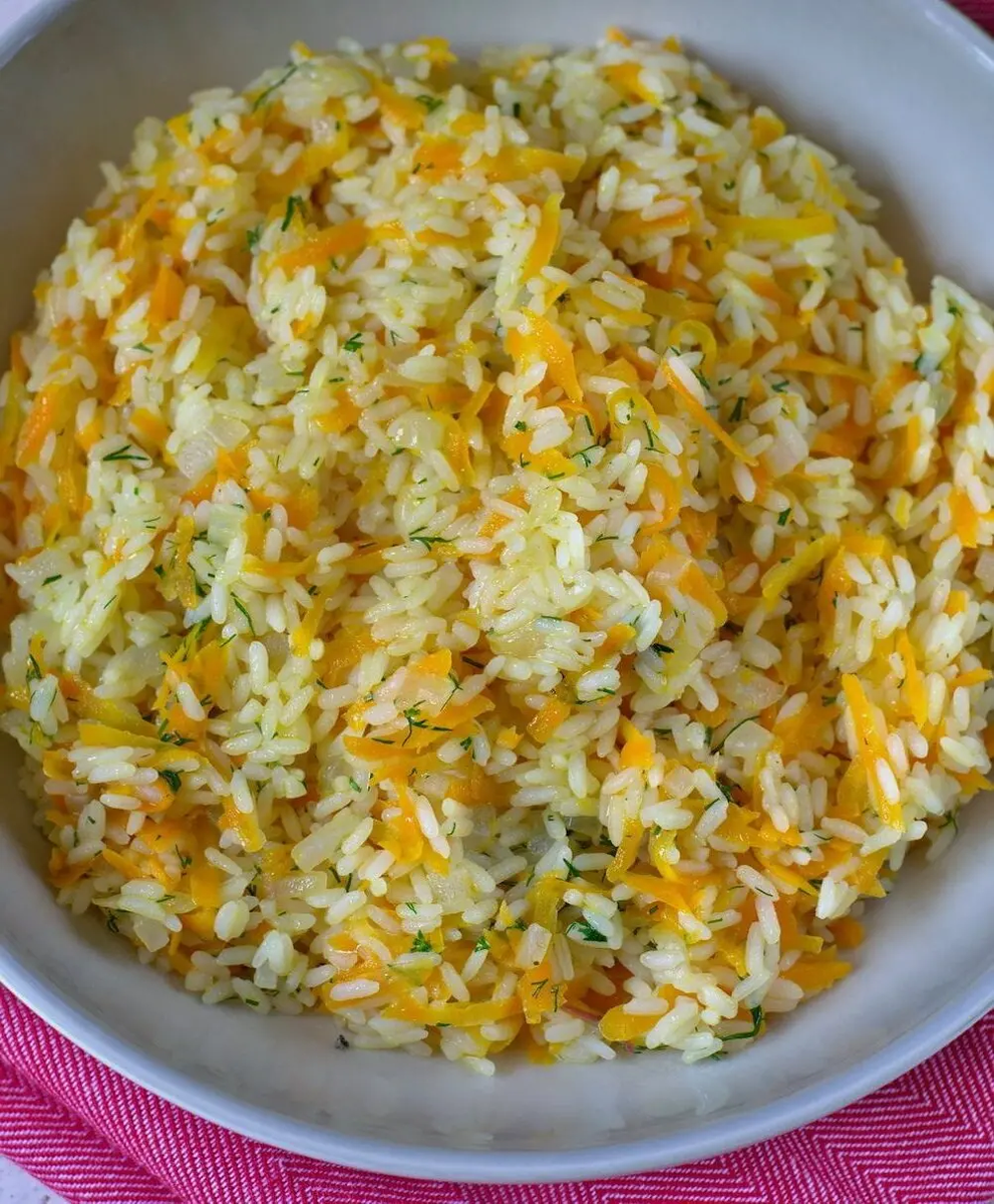 Все проще, чем кажется. Главное берите хороший рис, а не дробленку и хорошенько промывайте перед готовкой. 200 гр. риса 1 большая луковица 1 средняя морковь 1 большая столовая ложка измельченного укропа 2-3 стакана бульона или воды по желанию перец по вкусу 2-3 столовые ложки растительного масла соль Нарежьте лук небольшими кубиками. Очищенную морковь натереть на крупной терке. Разогрейте масло в большой сковороде. Добавьте сырой рис, лук и тёртую морковь. Быстро обжарьте. Затем добавьте 1-2 половника бульона или горячей воды. Накройте крышкой и тушите на медленном огне, периодически помешивая. Постепенно вливайте бульон. В конце, когда рис разбухнет и станет мягким, добавьте нарезанный укроп. При необходимости посолите и поперчите по вкусу. Подавать горячим.