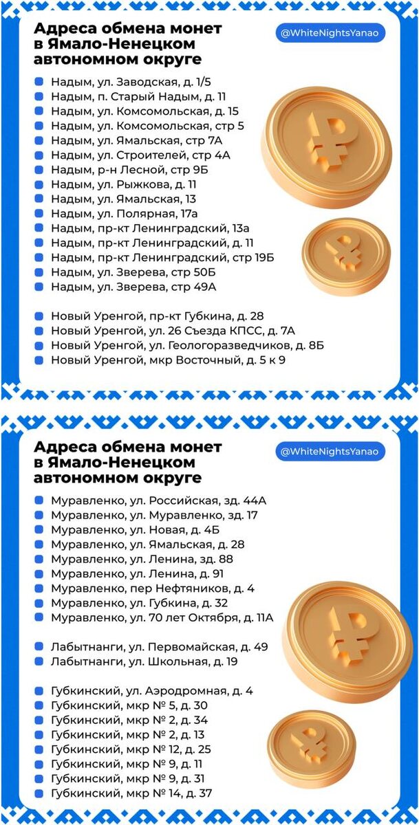 «Монетная неделя» началась на Ямале Приносишь мелочь в пункт приема —> меняешь на наличку —> зачисляешь деньги на счет. Акция проходит до 4 октября. Провернуть авантюру можно в 22 магазинах «Монетки» и некоторых банках нашего города. Со списков адресов можно ознакомиться на сайте ⬅ Подписаться | Прислать новость | Дать «буст»
