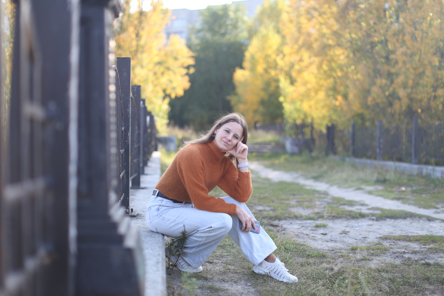 Тонкие свитера из кид-мохера завершали холодный сезон перед летом, и они же открывают новый. Плотные свитера ещё не хочется носить, хлопковые ткани уже не греют, а вот эти тоненькие - самое то: Согретый солнцем, продуваемый прохладным ветром тонкий свитерок из кид-мохера на шёлке от Lana Gatto (75% суперкид мохер, 25% шёлк; Италия; длина нити 212м/25г, цвет 14198). Общий вес 80 грамм, 4 неполных моточка. Посадка свободная в пройме. С лёгкой руки названный "рыжиком", под этим названием и вошёл в коллекцию остальных "паутинок". Кто не знает - даю справку: паутинками называют пуловеры из нежного кид-мохера, которые вяжут очень тонкой ниточкой на достаточно толстых спицах, благодаря чему полотно становится полупрозрачным. У меня не очень толстые спицы - №3,5 - и эффект прозрачности не такой сильный, но тоже присутствует. На солнце "рыжик" просто расцветает: Это моя четвёртая "паутинка", связанная абсолютно так же, как и её предшественницы, и скажу по секрету, в заначке есть пряжа ещё на 4