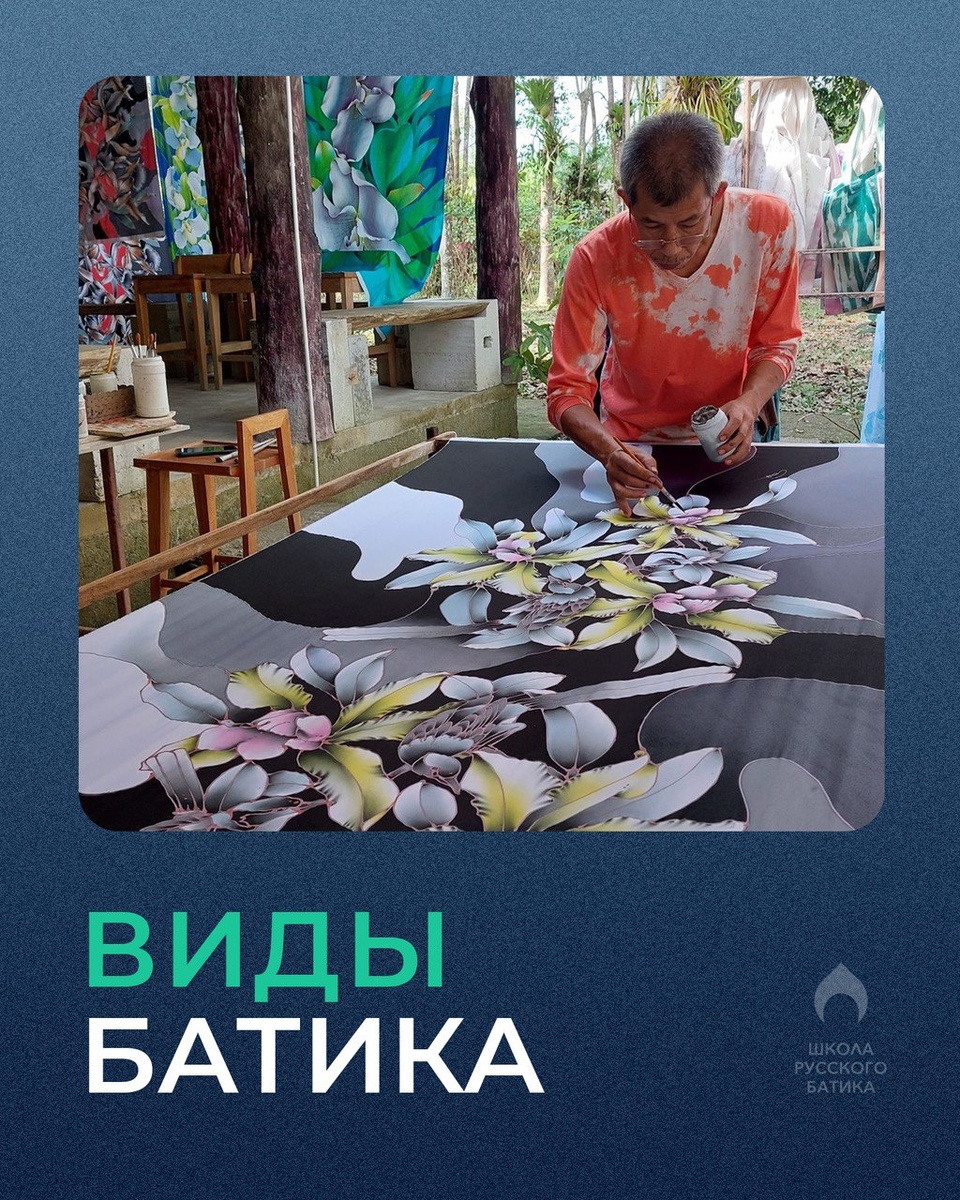 Думаю, время поговорить о видах батика по способу резервирования, ведь их несколько. Тема это действительно большая, постараемся покороче: 🔶 Горячий батик — используется расплавленный воск, работать по ткани можно кистями, штампами, чантингом, батик-штифтом (электроприбор). В-основном горячим способом расписывают хлопковые ткани. Но бывает и шелковые. 🔶 Холодный батик — резерв холодный на основе резинового клея, а для нанесения используются стеклянные трубочки. Такой резерв легко пропитывает тонкие ткани — шифон, шелк. 🔶 Узелковый батик — тай-дай, шибори. Создаются путем сложения и сматывания. Тай-дай более абстрактен, а шибори очень популярен в Японии и это очень непростая техника сложения и сматывания ткани в определенном порядке для получения изящных геометрических форм. Как раз в этом месяце мы много говорили об этом в нашем Telegram-канале. Есть ещё свободная роспись — когда используются растекания, эффекты, но об этом позже... #батик #batik #шибори #тайдай #школарусскогобати