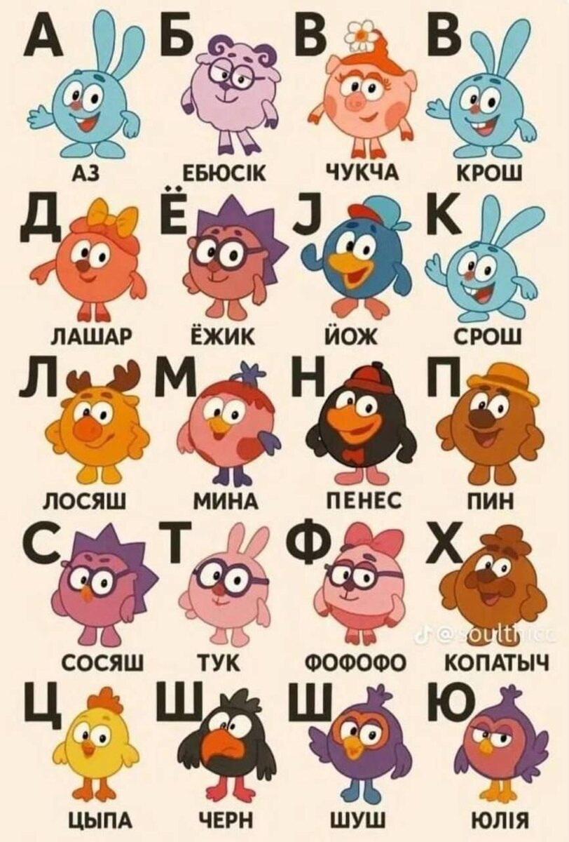 ChatGPT — не наш! На запрос об изготовлении алфавита со Смешариками он сделал такое 👆🏻 Теперь у вас есть новые прозвища для коллег, но ИИ явно свернул не туда. @lobushkin