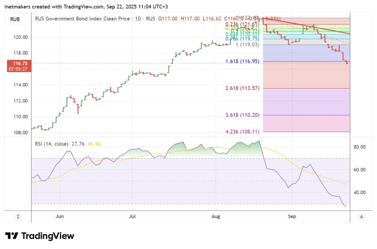 Давление на рынок сохраняется, при этом облигации - индекс RGBI чувствуют себя не лучше, продолжая снижение