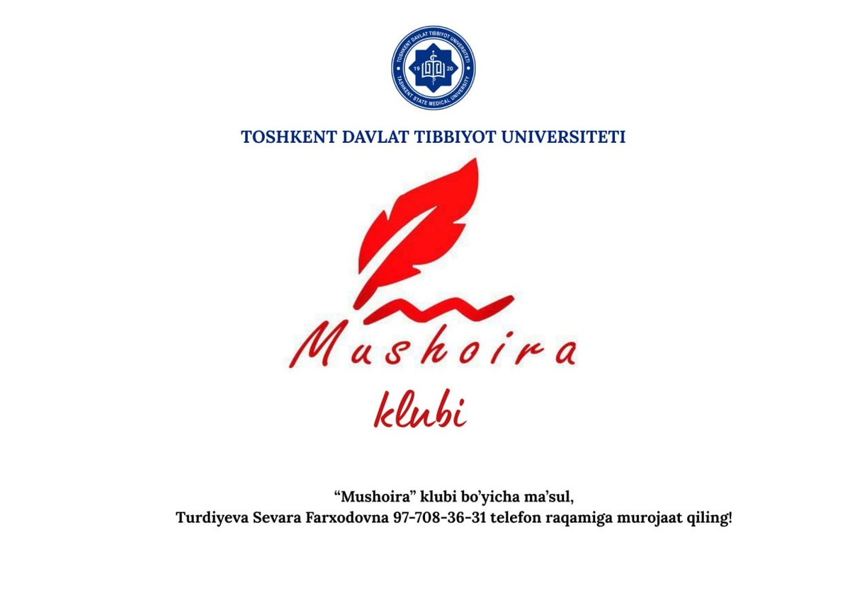 💬Diqqat, ijodkor yoshlar! ➡️Sizda she’r yoki hikoya yozish, ularni ifodali o‘qish kabi iste’dodlar bormi? Unda sizni Toshkent davlat tibbiyot universitetining “Mushoira” klubiga taklif etamiz! ❔Nega aynan “Mushoira” klubi? 🔹O‘z ijod namunalaringizni tengdoshlaringiz bilan o‘rtoqlashish va ularning xolis bahosini olish imkoniyati; 🔹She’riy va nasriy ijod mahsulotlaringizning gazeta va jurnallarda chop etilishi; 🔹 Universitet va boshqa OTMlararo ijodiy tadbirlarda ishtirok etish; 🔹 Ijodkor va kitobxon do‘stlar orttirish; 🔹 She’riyat va nasr yo‘nalishida ko‘nikmalarni oshirish; 🔹 “Mening birinchi kitobim” loyihasi doirasida o‘z kitobingizni chop ettirish imkoniyati! 📆Ro‘yxatdan o‘tish muddati: 2025-yil 23-sentyabr, soat 15:00 ga qadar. 📞Aloqa uchun: “Mushoira” klubi bo‘yicha mas’ul — S.F. Turdiyeva 97-708-36-31 Nimani kutyapsiz? 📚Ijodkor yoshlar safidan joy oling! ✅Rasmiy sahifalarimiz: Telegram | Facebook | Instagram | YouTube | X | LinkedIn