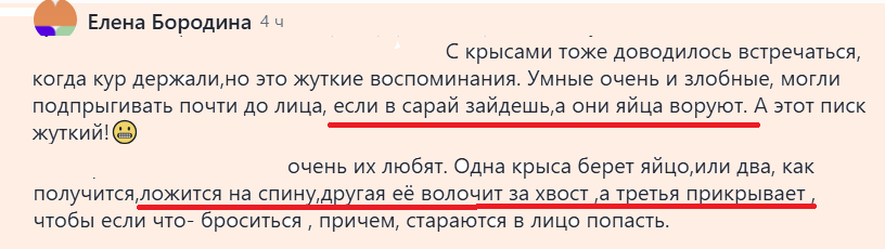 И вот что написала Елена (которую я дальше буду называть своей подругой): «С крысами нам доводилось встречаться, когда мы кур держали. Они умные и злобные, могли вверх попрыгивать почти до лица, если в сарай зайдешь, а они яйца воруют. И жутко пищат... Одна крыса берет яйцо (или два яйца, как получится), ложится на спину. А другая её волочит за хвост...