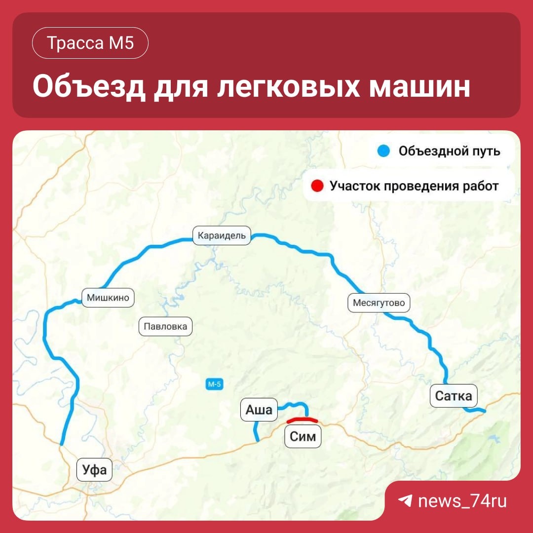 В ответ на пост На трассе М-5 под Симом начали ремонт 18 километров дороги. Как объехать пробки, рассказали дорожники Техника начала латать асфальт на участке с 1579 до 1597 километра. Еще заменят ограждения и нанесут разметку. Ремонта здесь не было с 1950-х годов, за это время нагрузка на трассу увеличилась, уточнили в Упрдоре. Точные сроки окончания работ пока не называют. Одна полоса на Челябинск на 1594 километре закрыта, введен реверс. Водители в выходные уже прочувствовали пробки, дорожники предложили решение. Как объезжать затор на легковых и грузовых машинах — смотрите в карточках ⬆️