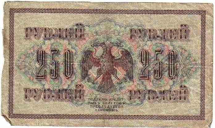 На купюрах номиналом 3, 5, 10, 250 рублей (1905–1917 гг.) написано только «Государственный казначейский билет» или «Государственный кредитный билет». Например, на 250-рублевой купюре 1917 года, которая была выпущена уже после Февральской революции, все еще нет упоминания о России — только двуглавый орел и надпись «Государственный казначейский билет». - Монеты до 1914 года: