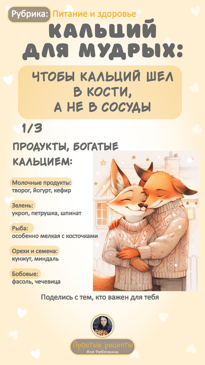Важная тема для каждого! После 50 лет организм начинает по-другому усваивать кальций, а кости становятся более хрупкими. Но не стоит паниковать — правильное питание поможет решить эту проблему! 💪 Почему после 50 сложнее усваивать кальций? • Меняется гормональный фон • Замедляется метаболизм • Снижается выработка некоторых ферментов Продукты, богатые кальцием: • Молочные продукты: творог, йогурт, кефир • Зелень: укроп, петрушка, шпинат • Рыба: особенно мелкая с косточками • Орехи и семена: кунжут, миндаль • Бобовые: фасоль, чечевица Что поможет усвоить кальций на 100%? • Витамин D: без него кальций не усвоится! • Магний: помогает кальцию усваиваться • Правильное сочетание продуктов Топ-5 правил питания: 1. Ешьте продукты с витамином D (жирная рыба, яичные желтки) 2. Добавляйте в рацион продукты с магнием (гречка, овсянка) 3. Избегайте избытка кофеина и соли — они выводят кальций 4. Готовьте правильно: не переваривайте овощи 5. Соблюдайте режим питания Лайфхаки для лучшего усвоения: • К
