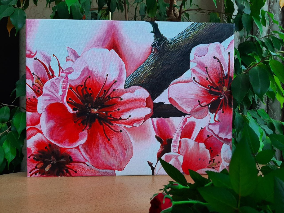 Сакура расцвела.....🌸🌸🌸 хоть и сентябрь на дворе😊 Розовые нежные лепестки светятся, пропуская сквозь себя теплые лучики солнца. Жаль только, картина не может передать волшебный аромат и свежесть цветущего сада.... Материалы: холст 30 см* 40 см, акрил Приобрести картину - ЗДЕСЬ #акрил #весна #природа #цветы #сакура #сияние