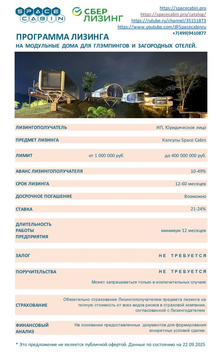 СБЕРЛИЗИНГ и SPACE CABIN - возьми модули в лизинг! Хорошие новости по понедельникам. «Сберлизинг» аккредитовал нас, как надежного поставщика. Теперь, вы можете взять в лизинг модули Space Cabin на условиях Сбербанка. На слайде представлены основные параметры: 💵 до 400 000 000 руб. 💵 взнос от 10%. 💵 до 60 месяцев. 💵 без залога. 💵без поручительства. 💵 досрочное погашение. Используйте лизинг, как дополнительный финансовый инструмент! #лизинг #модульныйдом #капсульныйдом #хаусбот #кредит