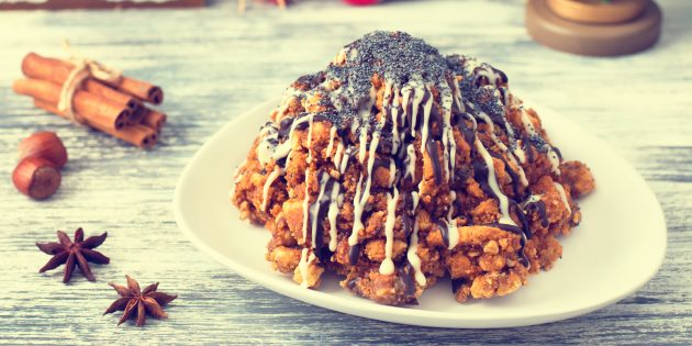 Торт муравейник – один из самых популярных и простых тортов в мире, такая общепринятая классика. Он сладкий, сытный и умопомрачительно вкусный, при этом относительно прост в изготовлении. Но откуда же к нам пришел этот замечательный десерт? Версия №1. Потомок ритуального блюда в форме кургана славы, которое выпекалось в честь погибших воинов. Версия № 2. Это переосмысленный восточный чак-чак (действительно чем-то похож) по принципу приготовления. Версия № 3. Идея создания десерта возникла у кондитера из Франции, который наблюдал за муравьями, перетаскивающими кусочки пирога, и нашел что, это прекрасная идея- сделать настоящий торт, похожий на муравейник. Но, к сожалению, видимо это всего лишь легенда. Версия № 4. «Муравейник»-это слегка измененный вариант американского "торта из воронки"(или "торт из мясорубки"). "Торт из воронки" появился в среде немецко-голландских колонистов штата Пенсильвания. Для его приготовления заварное тесто выливали через воронку на сковороду и поджаривали