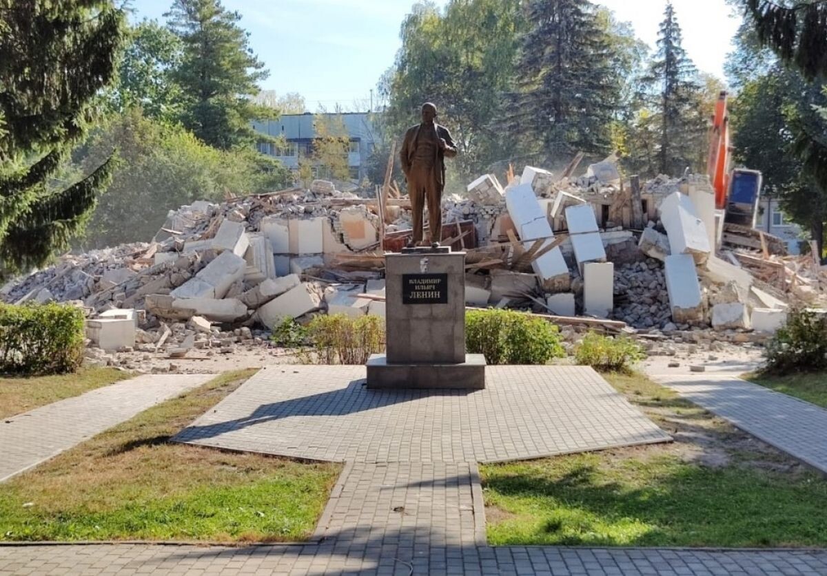 В соцсетях появились кадры сноса дома культуры в брянском поселке Мичуринский. Здание 1957 года постройки разобрали за несколько дней. Местные жители опубликовали видео днем 21 сентября. На кадрах еще присутствовал главный фасад здания. Через несколько часов разобрали и его. Снесенный дом культуры составлял в поселке архитектурную композицию с памятником вождю мирового пролетариата В.И. Ленину. Теперь Владимир Ильич встречает мичуринцев в одиночестве, на фоне железобетонных руин. Местные жители в комментариях пытаются угадать, что появится на месте снесенного объекта. Фото: google maps, 2019 г. / источник. Фото: Подслушано Брянск / Мария Дребенец | источник.