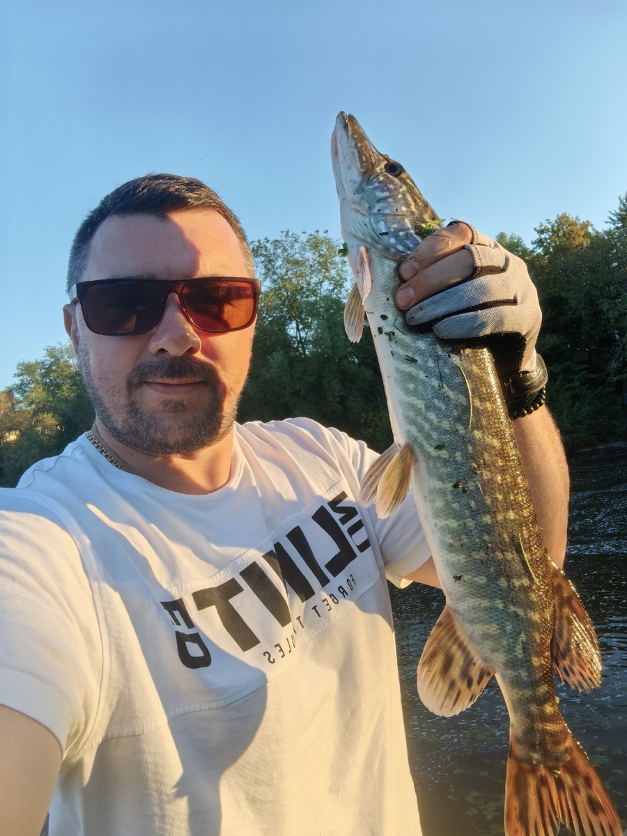 И вот на одном из таких мест, где речка делала небольшую излучину, а у противоположного берега росли камыши, случился первый удар. Резкий, мощный - сразу понял, что села приличная рыба. Щука попалась боевая, сразу пошла в камыши, пытаясь запутать леску. Пришлось форсировать события, не давая ей уйти в крепи.