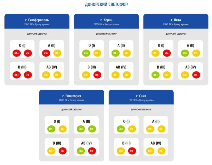 Республиканский «Центр крови» обновил данные потребности учреждения в запасах донорской крови. На этой неделе в Симферополе будут рады всем желающим пополнить запасы крови и её компонентов, особенно с первой и третьей группой крови. Также доноров с четвёртой группой крови ждут в Ялте, а с третьей – в Евпатории, Керчи и Саках. ЧИТАЙТЕ ТАКЖЕ: Ялтинцев призывают пополнить запас донорской крови «Очень ждем доноров с группой крови и резус-фактором, которые отмечены в светофоре красным и желтым! Обязательно возьмите с собой паспорт и СНИЛС. Надеемся на вашу помощь в пополнении запасов», – рассказали корреспонденту Крымского информационного агентства в «Центре крови». Напомним, что добровольно сдать кровь можно в ГБУЗ РК «Центр крови» (г. Симферополь, ул. Киевская, 37), а также в его филиалах (г. Ялта, ул. Свердлова, 14; г. Керчь, ул. Карла Маркса, 31; г. Саки, ул. Лобозова, 22; г. Евпатория, пр. Победы, 22), либо при проведении «донорских дней» выездной бригадой Центра крови в различных мун