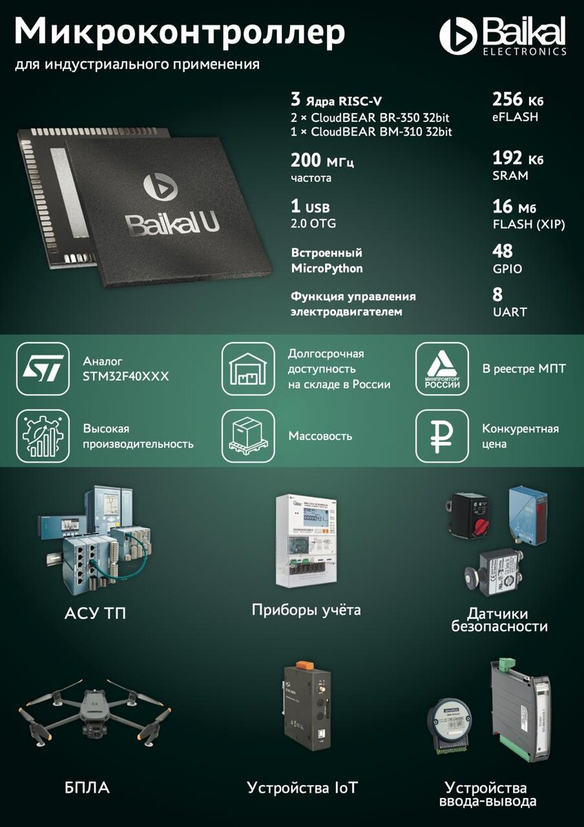 А вот и первый эксклюзив с Микроэлектроника 2025! «Байкал Электроникс», ведущий российский разработчик микропроцессоров и микроконтроллеров на форуме «Микроэлектроника» официально представил универсальный микроконтроллер Baikal-U (BE-U1000), предназначенный для широкого спектра применений Микроконтроллер использует отечественные ядра от компании CloudBEAR, построенные на открытой архитектуре RISC-V, что обеспечивает технологический суверенитет и позволяет не зависеть от иностранных разработок и ограничений, связанных с лицензионными соглашениями Устройство является отечественным аналогом широко распространенной линейки микроконтроллеров STM32F4хх – F7хх, и обладает схожими техническими характеристиками В настоящий момент оно проходит процедуру регистрации в Реестре российской промышленной продукции, которая должна завершиться в течение 1-2 месяцев За счет универсальности, производительности и технологической независимости микроконтроллер Baikal-U (BE-U1000) может быть использован
