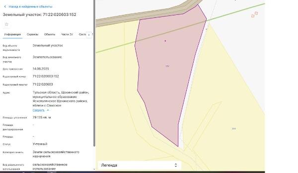 Название: площадью 79125 кв.м, с кадастровым номером 71:22:020603:152, категория земель «Земли сельскохозяйственного назначения