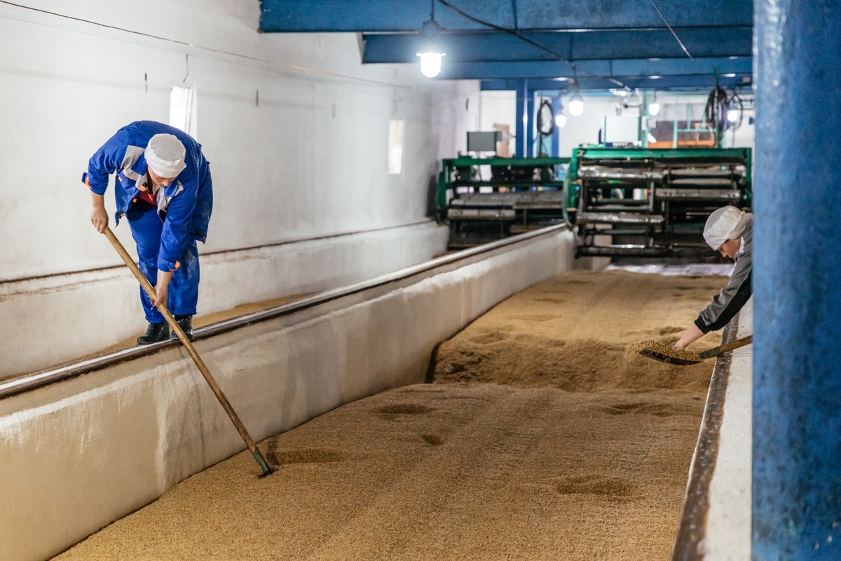 В производстве натурального солодового спирта никак не обойтись без непростой, но абсолютно необходимой технологии соложения зерна. Соложением называют процесс прорастания зерна и превращения его в солод. В условиях завода это происходит при контроле температуры и влажности воздуха. Символично, но этот традиционный для истинной русской водки процесс проходит в историческом здании Иткуля, построенном более ста лет назад. Сначала зерна проса и ячменя замачивают, очищают водой и кислородом, затем через 7-10 дней оно прорастает – и вот он, солод. Мы перемалываем его с чистейшей артезианской водой, чтобы получить солодовое молочко – натуральный фермент, который участвует в процессе осахаривания крахмала, высвобожденного из зерна.