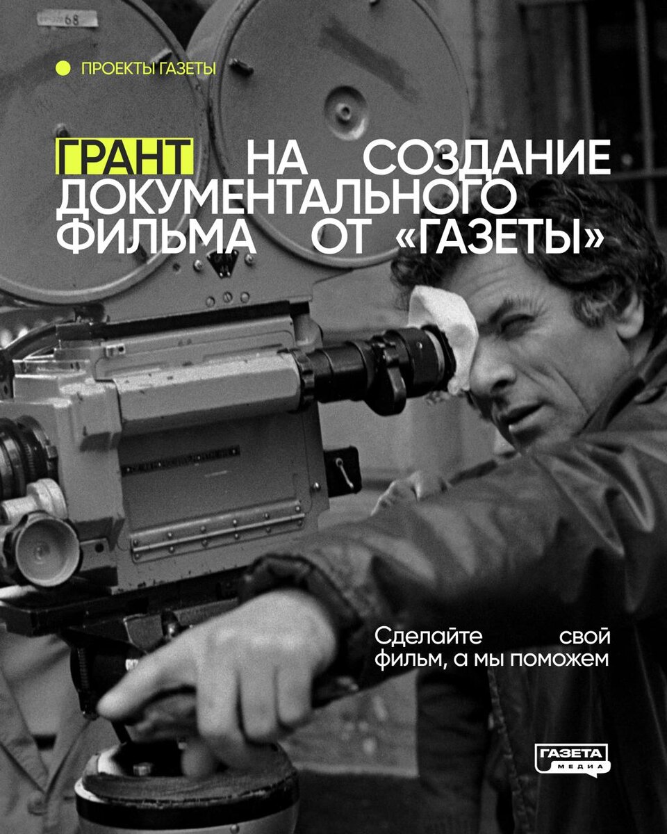 Для тех, кто мечтает снять свой фильм «Газета» запускает грант для молодых авторов и команд на создание короткометражного документального кино! Ищем крутые идеи, которые через исследовательский подход и визуальный язык рассказывают о чем-то важном. Мы приглашаем режиссеров, журналистов, художников и целые команды. Главное — не опыт, а ваша идея и желание ее реализовать. Сумма гранта: до 300 000 рублей. Успейте подать заявку до 15 октября. Все детали и форму заявки вы найдете на сайте. За процессом конкурса и съемок вы будете наблюдать в наших соцсетях, а также сможете принять участие в голосовании, выбрав самую лучшую идею. Делитесь постом с друзьями, которые хотят проявить себя. Будем вместе исследовать реальность через язык кино! #газета_проекты