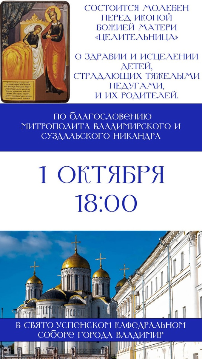 По благословению митрополита Никандра в Свято-Успенском кафедральном соборе состоится молебен о здравии детей 1 октября, в день празднования иконы Божией Матери «Целительница», Русская Православная Церковь по инициативе Святейшего Патриарха Кирилла проводит особые молебны об исцелении детей, страдающих тяжелыми заболеваниями, и о даровании сил их родителям. Присоединиться к соборной молитве приглашаются все желающие. Ждем вас: 📅 Дата: 1 октября 2025 г. 🕕 Время: 18:00, 🏛 Место: Свято-Успенский кафедральный собор (г. Владимир).