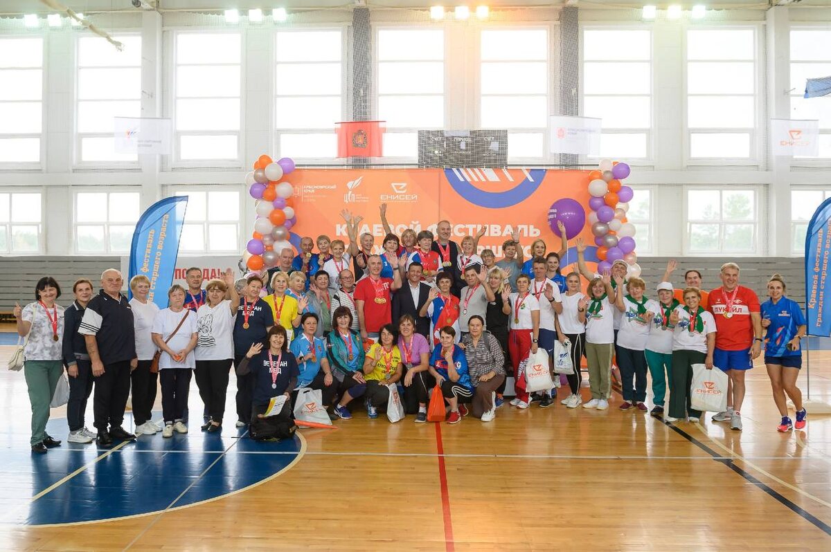 В ФСЦ «Енисей» состоялся «Краевой фестиваль граждан старшего возраста» среди мужчин и женщин 50 лет и старше 195 участников фестиваля из Енисейского и Манского района, Красноярска и Лесосибирска собрались вместе, чтобы соревноваться в различных дисциплинах и обмениваться опытом на мастер-классах. В рамках краевого фестиваля проводились соревнования по миниволею🏐, шахматам, напольному керлингу🥌, настольному теннису🏓, плаванию🏊♂. Спортсмены демонстрировали свою силу и меткость в стрельбе из электронного оружия, дартсе🎯, на площадке ГТО💪. А также участвовали в мастер-классах "Северная ходьба", "Функциональный фитнес", игре "Джаккола". 🏆 Победители и призеры соревнований награждены медалями, грамотами и памятными призами. Каждый участник фестиваля получил сувенирную продукцию. Фестиваль стал праздником активности и спортивного долголетия, отличной площадкой для общения, обмена опытом и демонстрации неиссякаемой энергии и таланта старшего поколения✨