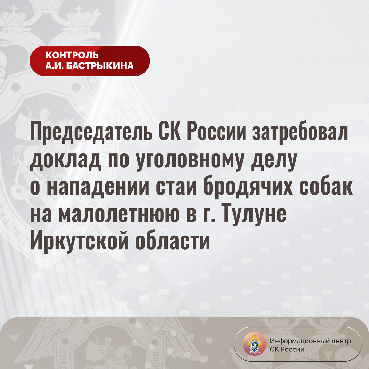 Председатель СК России затребовал доклад по уголовному делу о нападении стаи бродячих собак на малолетнюю в г. Тулуне Иркутской области В социальной сети сообщается, что в сентябре текущего года в городе Тулуне Иркутской области стая бродячих собак набросилась на девятилетнюю девочку. Помощь малолетней оказал очевидец. Отмечается, что в населенном пункте обитает большое количество безнадзорных животных, однако мер к организации их отлова не принимается. В СУ СК России по Иркутской области возбуждено уголовное дело. Председатель Следственного комитета Российской Федерации Александр Иванович Бастрыкин затребовал у руководителя СУ СК России по Иркутской области Анатолия Викторовича Ситникова доклад об установленных в ходе проведенных следственных действий обстоятельствах, а по завершении расследования уголовного дела – о его результатах. Исполнение поручения поставлено на контроль в центральном аппарате ведомства. #СледственныйКомитет #СКРоссии #СКР #ИЦСКР #ИнформационныйЦентр #АлександрБ