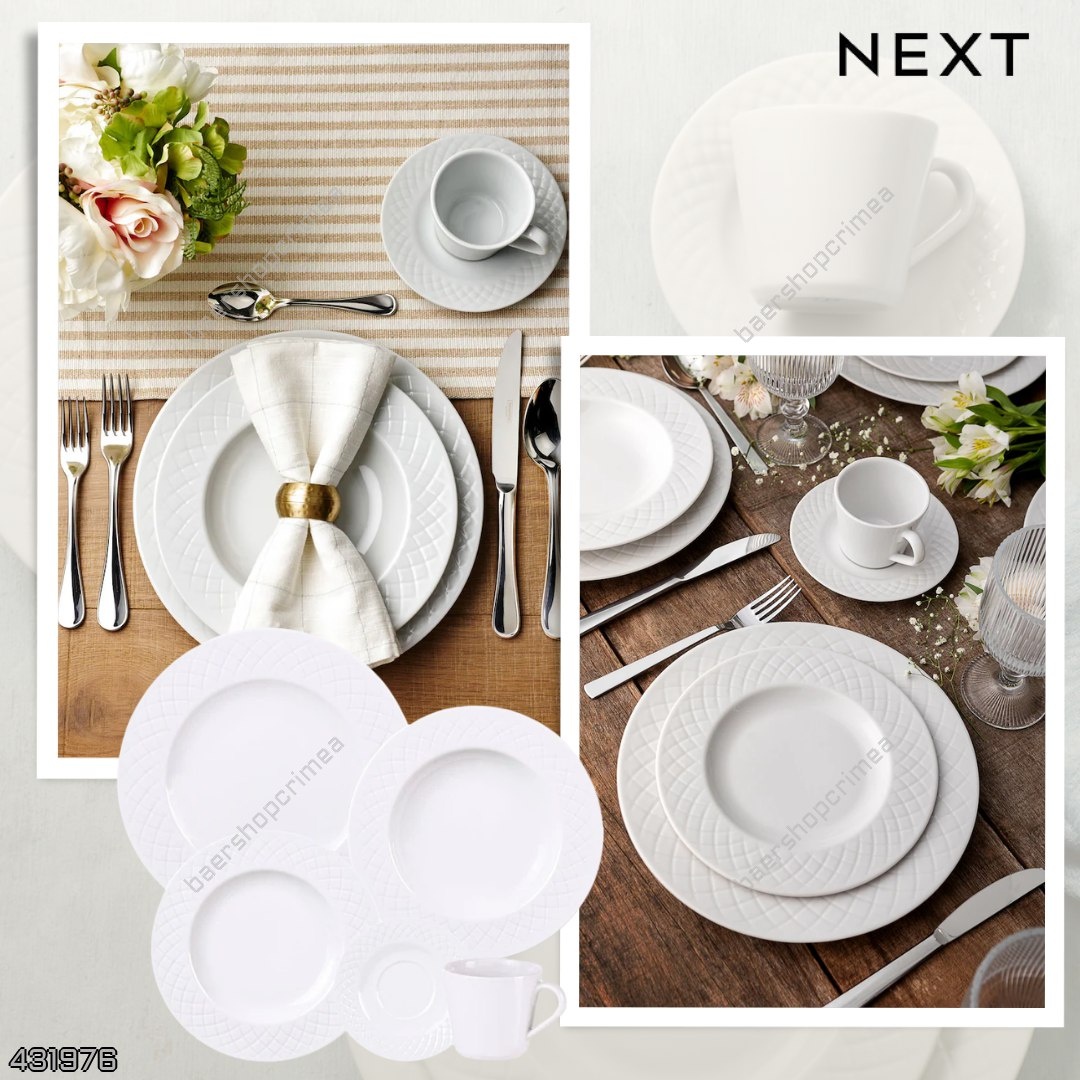 4 обеденные тарелки, 4 суповые тарелки, 4 закусочные тарелки, 4 блюдца и 4 чашки объемом 185 мл