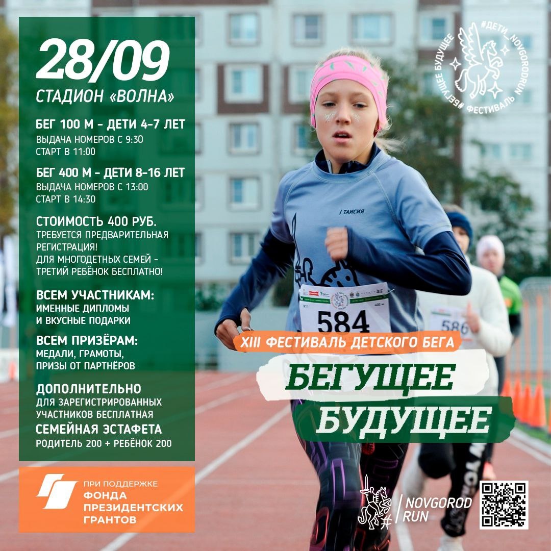 Вы уже зарегистрировались на VIII фестиваль детского бега «Бегущие будущее»? Новгородский беговой клуб NovgorodTRI с радостью приглашает вас принять участие в этом увлекательном мероприятии! Неважно, насколько вы подготовлены физически, вы всегда можете показать свой ум и волю к победе. 28 сентября на стадионе «Волна» состоится забег, где вы сможете продемонстрировать свои навыки и побороться за главный приз. Не упустите возможность стать частью этого удивительного события! Регистрация заканчивается уже сегодня, 22 сентября, так что не упустите шанс подать заявку на участие по следующей ссылке: [Регистрация](https://reg.o-time.ru/race/25549). Возможно, именно вы станете призёром или даже победителем этого забега!
