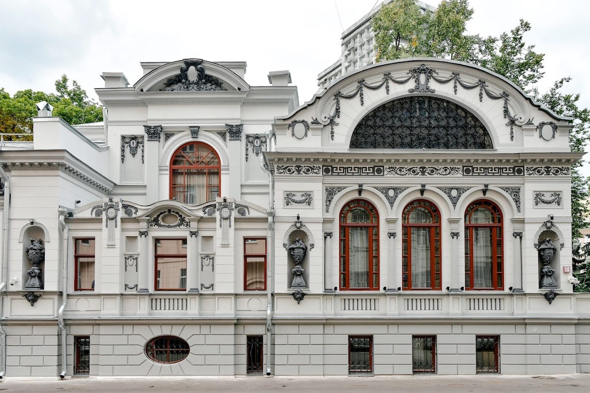 В Москве множество исторических построек с классическими элементами, такими как портики и колонны. Однако особняк на Поварской, 9 выделяется своей необычной архитектурой. Здание выглядит как сочетание разнородных объемов: две вытянутые вверх секции соединены протяженной низкой частью высотой в полтора этажа, а крайний правый сегмент увенчан мезонином с полукруглой крышей, напоминающей железнодорожные перекрытия. Хотя асимметрия наводит на мысль о модерне, обильная классическая лепнина — вазоны, грифоны, картуши с изображением медузы Горгоны — указывает на иные стилистические влияния. История этого здания действительно полна архитектурных метаморфоз и неожиданных поворотов. Данное строение представляет собой архитектурный объект смешанного стиля. В нем сочетаются элементы классического усадебного строения и характерные особенности особняков раннего 20 века. На протяжении своей истории здание подвергалось многочисленным реконструкциям и расширениям, над ним трудились различные архитекто