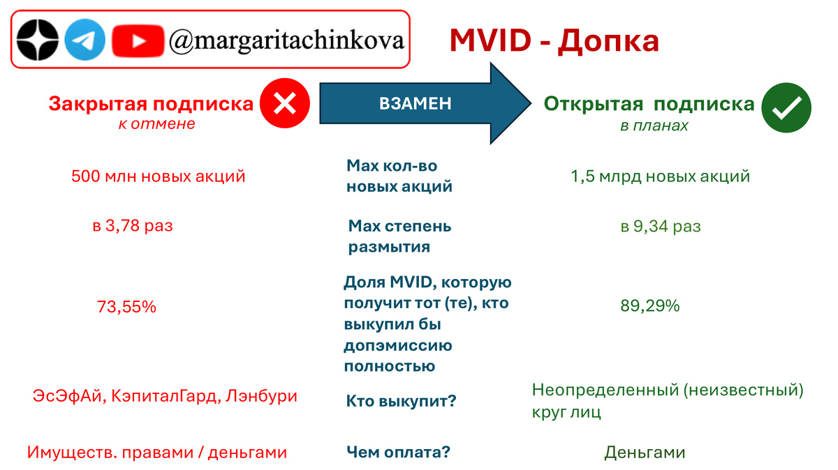 Итак, на рассмотрение ВЗГОСА 13 октября вынесли выпуск 1,5 млрд новых акций. Ещё не факт, что весь этот объем новых акций используют (часто закладывают с некоторым запасом), так что итоговое размытие может оказаться меньше. Но даже просто пока выставленное на одобрение максимальное размытие до 9,34 раз выглядит внушительно и выделяется на фоне всех остальных допок на нашем фондовом рынке. Это, конечно, пока ещё не сценарий ОВК точь-в-точь в цифрах (там на одобрение было поставлено размытие более чем в 100 раз), но суть (спасение + смена контроля?) вдруг может оказаться похожей. Про историю трансформации открытой подписки MVID в закрытую и обратно в открытую писала здесь. Ниже просто мои вопросы ко Вселенной. Возможно, сам MVID пока не знает на них ответа, так как открытая подписка более гибкая (чем закрытая) и позволяет принимать решения исходя из обстановки в моменте. Единственный официальный комментарий от пресс-службы М.Видео: Компания внимательно оценивает состояние фондовог