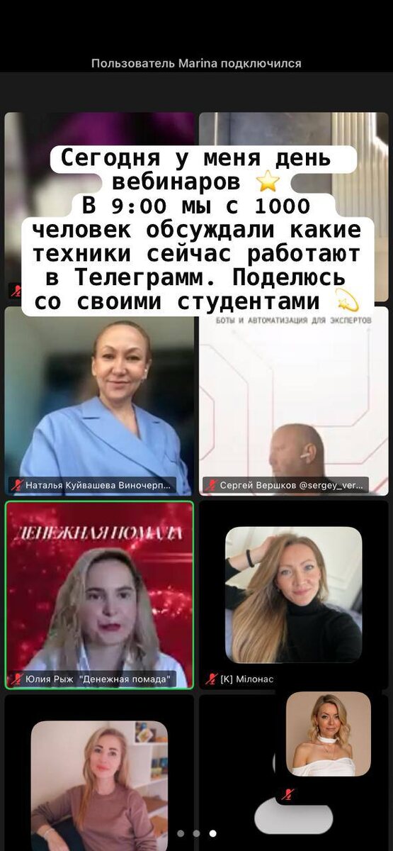 Утро сегодня очень насыщенное, с 9 утра три вебинара 🚀🚀🚀 1. Вебинар по продвижению Телеграмм, нас было больше 1000 человек 🤯 обязательно расскажу все новости на моем обучении «Продающий Telegram-канал за 6 шагов». Начало обучения 06.10, кому интересно пишите в личку @vasilevaep 2. Встретились на мастермайнде с моими девочками из «Кода Легенды» 3. Вебинар от компании РЕСО, часть марафона «Агент Всемогущий»