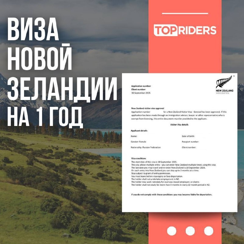 Открываем Новую Зеландию с TOP RIDERS 🇳🇿 Новая Зеландия – страна дикой природы: ледники, вулканы, фьорды и пляжи на краю света. Прогулки по локациям «Властелина колец», каякинг среди пингвинов и южное звёздное небо превращают поездку в незабываемое приключение. И чтобы ваше путешествие прошло без забот – мы поможем с визой! ✔️ Электронная виза без личного визита – всё онлайн, биометрия не нужна ✔️ Срок рассмотрения – от 1.5-2 месяца ✔️ Бесплатно – один ребёнок до 13 лет при подаче вместе с двумя взрослыми ✔️ Обычно визы Новой Зеландии выдают либо однократные на даты поездки, либо мультивизы на 1 год, если у заявителя хорошая визовая история. 📍В услугу входит: – Аудит и сбор документов – Заполнение анкеты – Бронирование отелей и авиабилетов – Оплата визового сбора Мы подадим документы сразу, как только будет собран весь весь пакет! Пример кейса: У Клиенты ранее были визы, но не в Новую Зеландию. – Подали документы онлайн 15 августа. – Получили мультивизу Новой Зеландии 18 сен