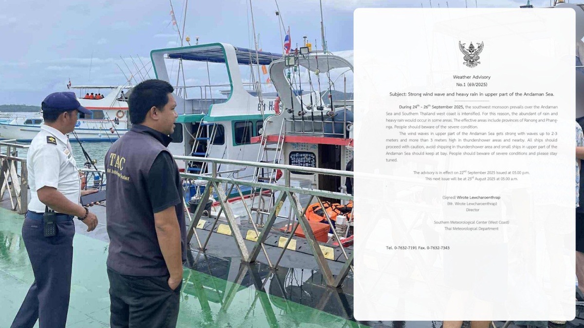 Метеорологическое предупреждение выпущено на Пхукете Пхукетское отделение Метеорологического департамента Таиланда (Phuket Met, юго-западный офис TMD) выпустило предупреждение о сложных погодных условиях в провинциях на побережье Андаманского моря в период с 24 по 26 сентября. Уведомление за подписью директора Phuket Met Вирота Леучаронтрапа было опубликовано в 16:44 дня 22 сентября, что указывает на его внеочередной характер. Плановые уведомления выпускаются ведомством в 5:00 утра. В тексте говорится об усилении юго-западного муссона в северной части Андаманского моря. Синоптики прогнозируют волны на море высотой до 3 м (и более 3 м в зонах штормов). Капитанам морских судов предписывается быть бдительными, маломерные суда должны оставаться на берегу. Никакой конкретный тайфун или тропический шторм в тексте Phuket Met не упоминается, но в общенациональных предупреждения TMD говорится про тайфун Рагаса в Южно-китайском море. Также на метеокарта TMD видно, что бангкоский метеоцентр о
