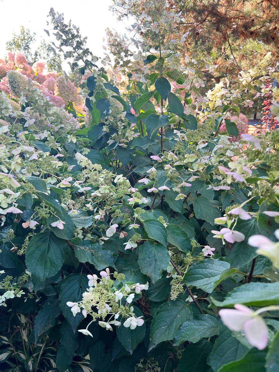 Мотыльковые сорта Гортензий это те, у которых фертильных больше чем Стерильных. Эти сорта невероятно воздушные, нежные, устойчивые к дождям и ветрам. Их можно не обрезать на зиму и снег их не сломает, потому что ему практически негде задерживаться. Мотыльковые сорта отцветают очень по разному. Например Вайт Леди слегка розовеет Цветочки опускает вниз и не очень красиво постепенно коричневеют фертильные цветочки. Не для первого плана сорт Красивый и нарядный до самого конца, пока не станет коричневым после заморозков Стареет очень медленно и красиво. Конец сентября, а коричневых цветов практически нет. Отличный сорт. Весной нежный белый, осенью постепенно становится ярче и ярче. Ранний сорт, да и цветет всегда, не пропускает сезоны Моя любимица с крупными соцветиями Осенью очень яркая и в кусте всегда присутствуют свежие соцветия с еще белыми цветочками. Стареет красиво и медленно, издалека вообще как только распустилась Мой куст еще молодой, но уже очень красиво и пышно цветет. Есть