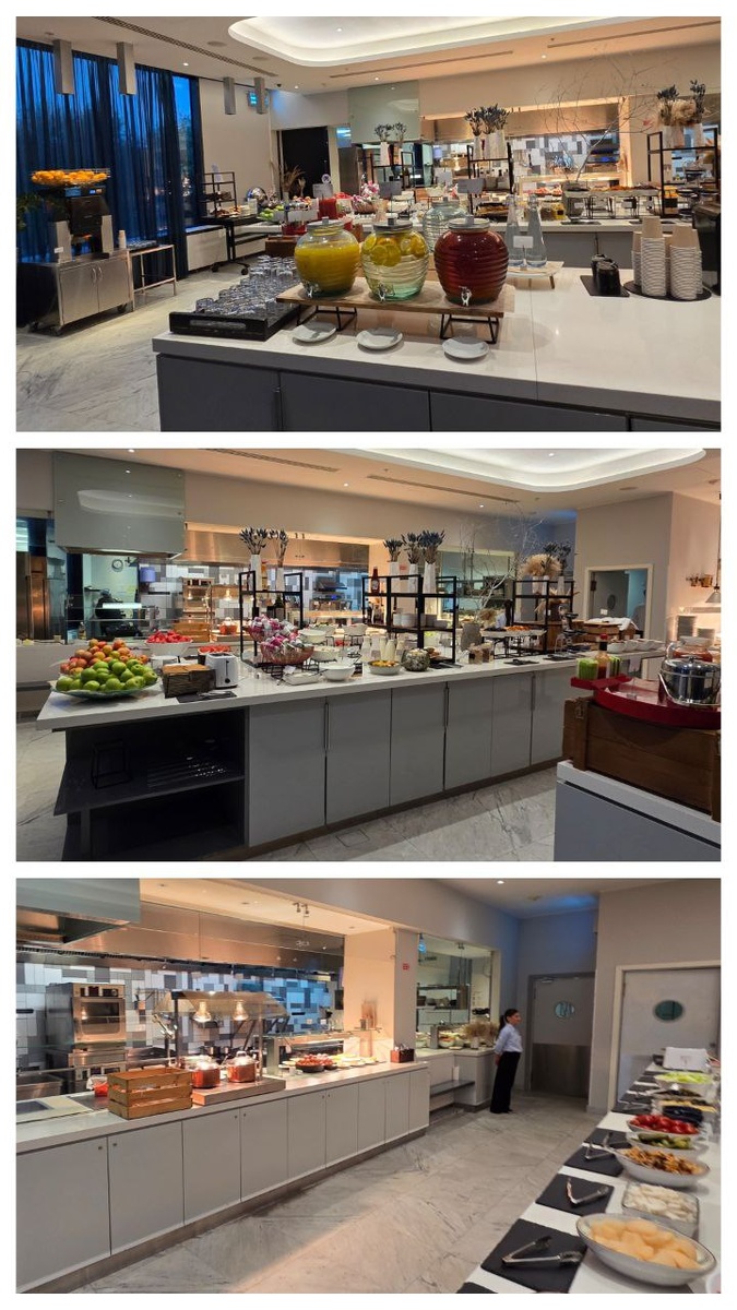 Следующий экспириенс – завтрак в формате «Шведский стол» на 1м этаже ресторана Stratosphere Cosmos Selection Moscow Sheremetyevo Airport Hotel 5*. Накрывают с 5.30 до 10.30, стоимость 1950 руб. В отличие от самой гостиницы, завтрак нас немного разочаровал. Толпы китайских гостей, суета, шум, и это ранним утром, когда мозг еще не работает. Стейшенов много - горячие, холодные закуски, свежевыжатый апельсиновый сок из специального автомата и морковный в кувшине, virgin bloody mary и чан с якобы рисовым супом конджи для китайцев. Приятно было увидеть маленькие спешалы, как свежее песто, оливковая паста, свои малосольные огурчики. Людей очень много на завтраке, поэтому яичной станции в этом 5-звездочном? отеле нет. Глазунья и омлет стоят уже готовые и остывшие — выглядят невкусно. Мы, конечно, попросили сделать свежую яичницу, что вызвало удивление ("ешьте, что дают"), но заказ все-таки исполнили (воспользовались служебным блогерским положением).😉 Довольно большой шведский стол, а вкус
