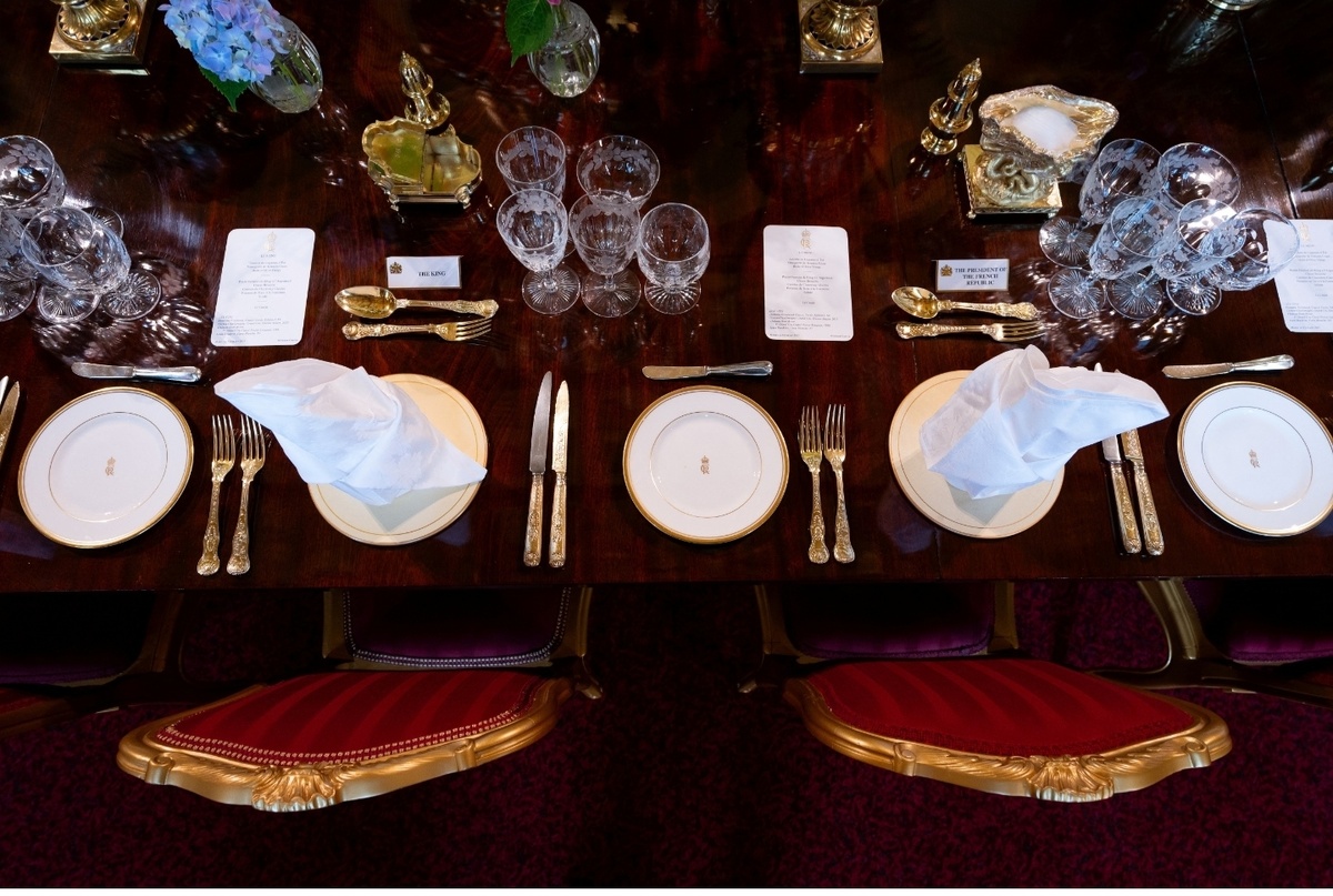 Королевский банкет впечатляет не только деликатесами и красотой дворцовых интерьеров, но и своей продуманной сервировкой. Вы наверняка замечали, что перед кувертом каждого гостя стоит не один, а сразу несколько бокалов. Для неискушенного взгляда это может показаться излишеством, но в этом есть своя логика и традиции. Каждый бокал предназначен для строго определенного напитка. Во время официального банкета подают разные блюда, и к каждому из них подобран свой напиток. Чтобы вкус напитка был раскрыт максимально полно, для каждого напитка используют отдельную форму бокала. В результате у каждого куверта ставят пять бокалов. Во времена Елезаветы II была распространена вот такая схема расположения бокалов. Сейчас мы все чаще видим вот такое расположение бокалов. В реальности это выглядит вот так. В любом случае, согласно английской традиции, бокалы располагаются в правой стороне куверта, над ножами и чуть над кувертом соседа. На столе всегда присутствуют: Вода сопровождает гостя на пр