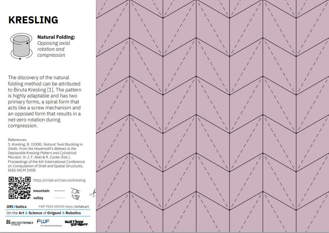 Или ОРИГАМИ КРЕСЛИНГ, МОТИВ КРЕСЛИНГ, ШАБЛОН КРЕСЛИНГ. (Очень часто эту фамилию склоняют, но это ошибка, ибо речь идёт о женщине.) Из статей ИЗГИБ ЙОШИМУРЫ и СКЛАДКА МИУРЫ вы узнали, что плоский гибкий материал, будь то лист бумаги, пластика или металла, можно сложить различным образом, при этом в собранном виде они будут очень компактными, а развернуть их можно одним движением. Оказывается, это не предел, и существует ещё один (как минимум) вариант - СГИБ КРЕСЛИНГ. Техника оригами, предложенная немецкой учёной Бирутой Креслинг, заключается в применении противоположного осевого вращательного сжатия. Можно взять бумажную трубку и скручивать её в противоположных направлениях, одновременно сжимая скрутки, чтобы спонтанно получить очень точный ОРИГАМИ КРЕСЛИНГ (или ОРИ-КРЕСЛИНГ). Этот узор легко адаптируется и имеет две основные формы: спиралевидную, которая действует как винтовой механизм, и противоположную, которая при сжатии приводит к нулевому суммарному вращению. Использование тако