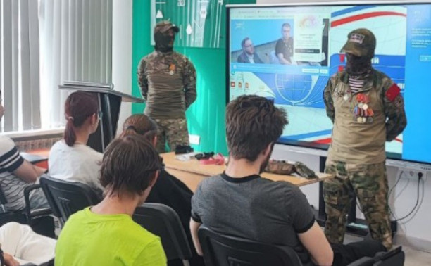 Наши земляки - добровольцы из БАРС 8 и 9, Шкет и Пряник, а также волонтер СВО и общественник Милюхин Сергей Владимирович - провели встречу со студентами Тульского колледжа профессиональных технологий и сервиса на улице Металлургов, 70 в Туле. Мероприятие было организовано совместно с исполнительным директором Тульского регионального отделения Общероссийского общественного движения по увековечению памяти погибших при защите Отечества "Поисковое Движение России" Четвериковой Еленой Евгеньевной. На уроке мужества военнослужащие рассказали о буднях наших военных в зоне СВО и о важности выполнения задач специальной военной операции. Студенты слушали очень внимательно. Тяжело было видеть слезы молодых девушек, когда бойцы рассказывали о том, как трудно мирным жителям на новых территориях, и о подвигах воинов России. Атмосфера быстро стала дружеской, бойцы показали и рассказали секреты выживания, привлекая к диалогу учащихся. Педагоги колледжа приняли самое деятельное участие в беседе, задав
