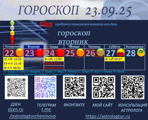 Сегодня — кульминация напряжённого аспекта Солнца с Нептуном. Это повышает вероятность путаницы, неопределённости, иллюзий, обмана и рассеянности. Информация может искажаться, намерения окружающих становятся неочевидными, а собственные поступки позже могут вызвать сожаление. Рекомендуется доверять фактам, а не эмоциям. Вторая половина дня, с 16:00 мск и до позднего вечера, появляется склонность к переоценке собственных сил, или к чрезмерной лёгкости в важных вопросах. В это время есть склонность к преувеличениям, можно поверить в слишком хорошее предложение, или пообещать больше, чем можем на самом деле. В финансах - велик соблазн сделать крупную покупку или инвестицию исходя из эмоций, а не здравого смысла — здесь стоит остановиться и всё тщательно проверить. В отношениях возможны недоразумения из-за слишком высоких ожиданий или неправильной интерпретации слов партнёра. Помимо этого, с 22.09.25 по 26.09.25 рекомендуется соблюдать осторожность. В этот период действует напряжённый аспек