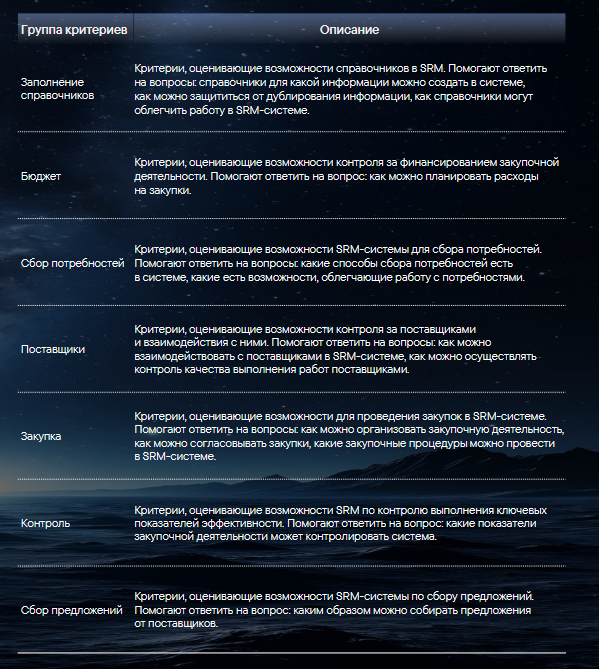 Если нужно поверхностно познакомиться с разными вариантами SRM, то имеет смысл «пробежаться» по рейтингам или исследованиям различных консалтинговых и аналитических компаний. Так, по крайней мере, получится найти точку отсчета для оценки систем управления закупками и понять, а на какие характеристики и возможности SRM обращать внимание на демонстрациях.