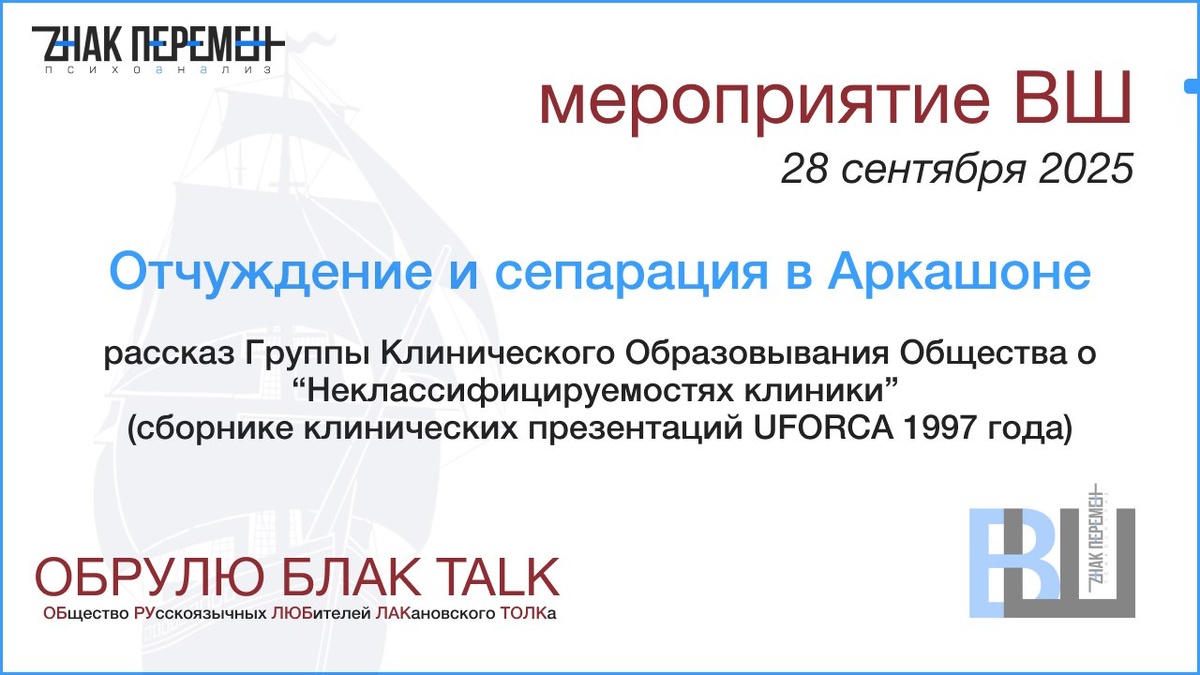 ⚡️ в вс. 28 сентября в zoom с 14 до 17 МСК состоится очередная встреча ВШ «Отчуждение и сепарация в Аркашоне» 🔹 группа клинического образовывания Общества Русскоязычных Любителей Лакановского Толка расскажет о своём опыте работы с текстом Аркашонской беседы «Неклассифицируемости клиники» (1997) прозвучат доклады: ✵ «Психоаналитическая клиника и её передача», вступительное слово. Степан Мощенко ✵ «Что делать с тем, что не поддаётся классификации?». Елена Литвинова ✵ «Уроки неклассифицируемости», по предентации Доминика Вале «Одна разрушенная семья». Евгения Дядичкина ✵ «Неологизм и ритурнель, или эхолалия?», по презентации Мари-Клод Сюро «Литературка». Иннокентий Кайнов ✵ «Имя в классификации» Елена Литвинова ✵ «Отчуждение и сепарация в Аркашоне». Степан Мощенко ⭐️ формат ВШ задуман для со-держания речи и знакомства, как наиболее открытая приветственная площадка нашего Общества. Мы будем рады как полным нулям, так и не совсем пустым множествам багажей и знаний. В этом проекте