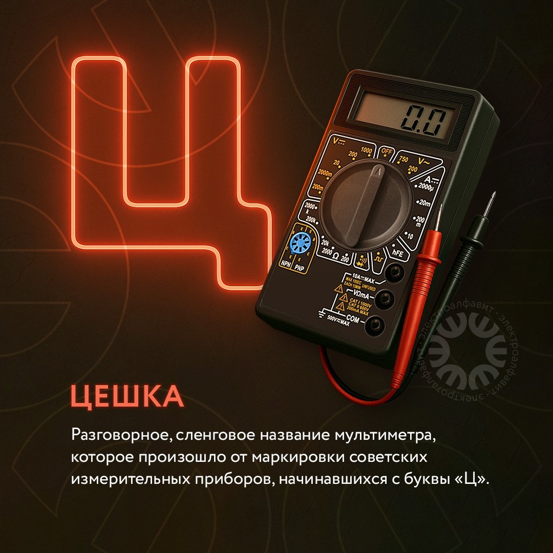 Электроалфавит: буква 😶 — ЦЕШКА 😎 Это распространённый разговорный и профессиональный синоним мультиметра. Название произошло от первой буквы в названии серии советских измерительных приборов «Ц», например популярных моделей Ц-20. Мультиметр — универсальный прибор для измерения напряжения, тока и сопротивления, а также для проверки целостности цепей. Бывает двух видов: 🔹 Аналоговый — со стрелкой; 🔹 Цифровой — с дисплеем, более удобный и точный. С помощью мультиметра можно: ➡️ проверить батарейку или аккумулятор ➡️ найти «обрыв» провода ➡️ измерить напряжение в розетке ➡️ убедиться в правильности подключения цепи 💬 А как вы называете мультиметр? Заказать мультиметр на нашем сайте 🌐 #ПланетаЭлектрика_электроалфавит #ПЭ_инструменты #elektroru