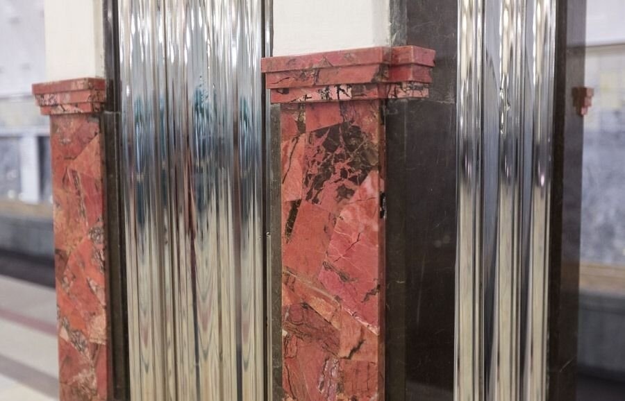 Если вы бывали на одной из самых красивых станций московского метрополитена под названием "Маяковская" - наверняка обратили внимание на вставки из розового камня внизу стальных колонн.